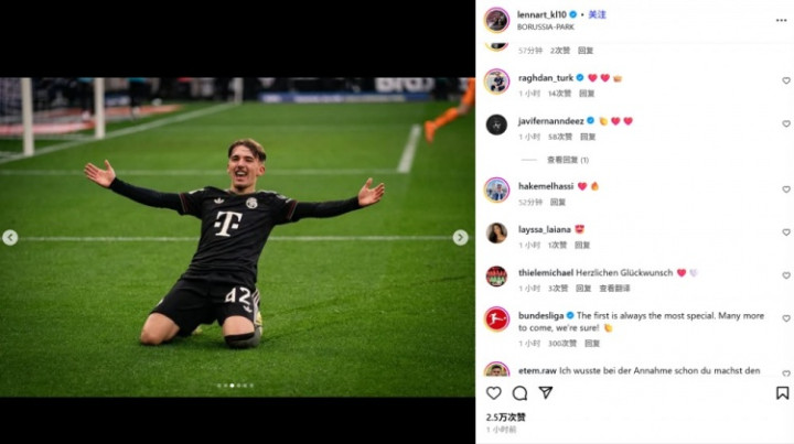 Tài khoản chính thức của Bundesliga cũng xuất hiện trong khu vực bình luận và khuyến khích: "Bàn thắng đầu tiên luôn đặc biệt! Tôi tin rằng bạn có thể ghi nhiều bàn thắng hơn trong tương lai."